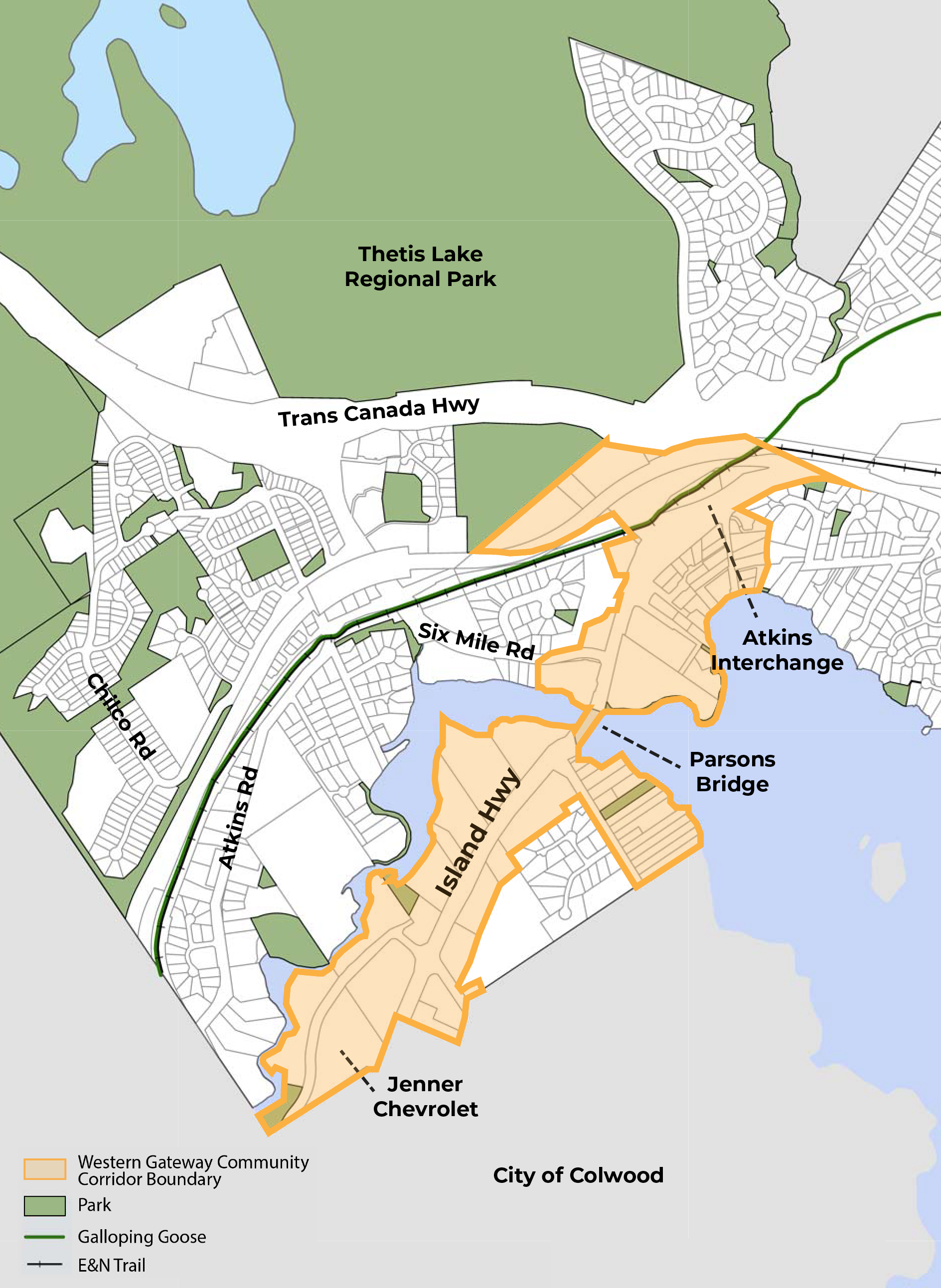 A key focus of our current phase of engagement is the Western Gateway Community Corridor, the area along Island Highway from the Colwood border to the Atkins Interchange (see map below). This corridor is an important multi-modal route, providing access to the Blink RapidBus line, Galloping Goose Trail, and surrounding neighbourhoods. The Town is exploring future land use options here, including opportunities for new housing, businesses, services, and employment space.