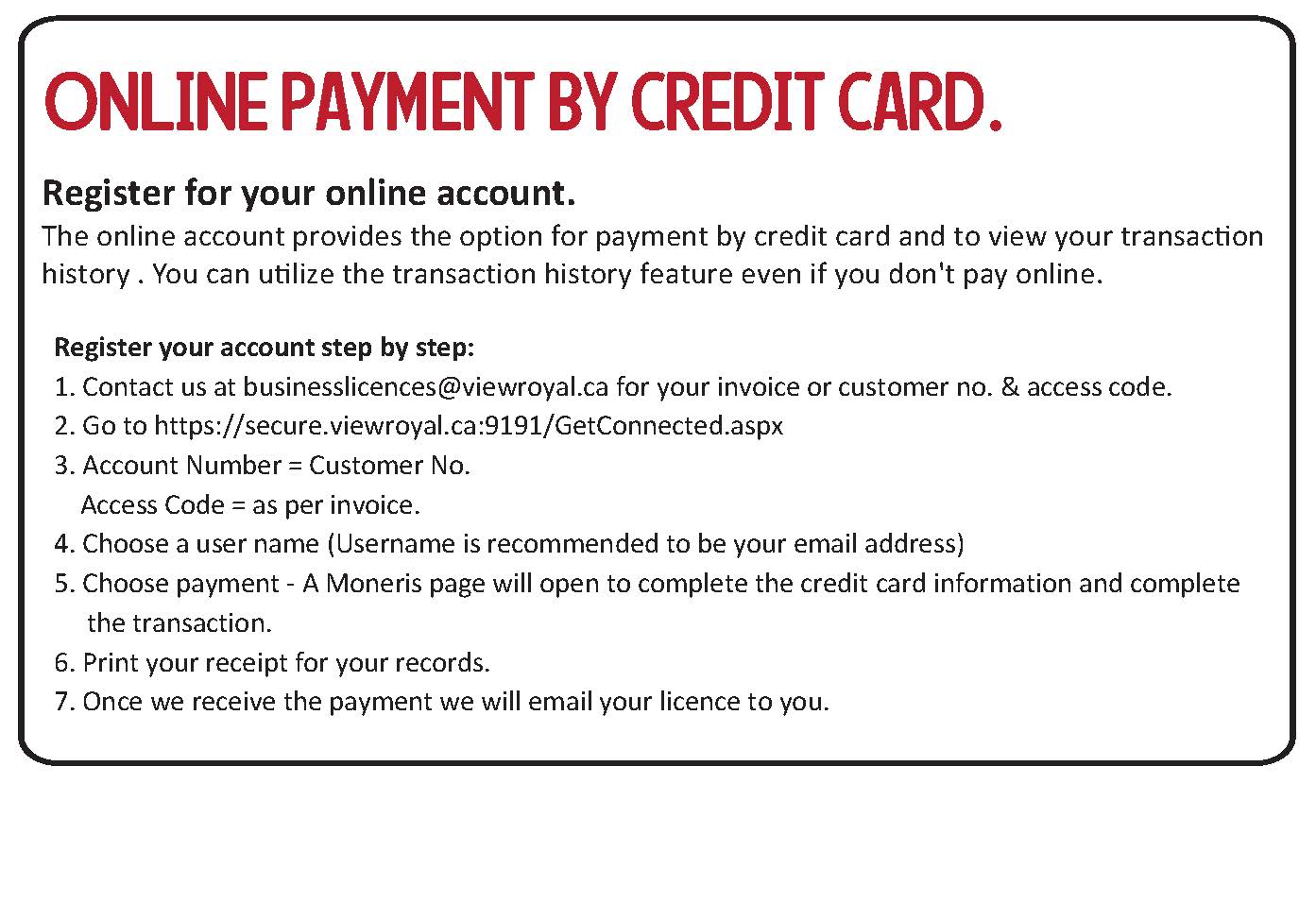 ONLINE (available for renewals only): once registered for Online Services, renewals can be paid online by credit card. Following online payment, please contact us at businesslicences@viewroyal.ca or phone 250-479-6800 to ensure the correct email address is on file to recieve your licence.