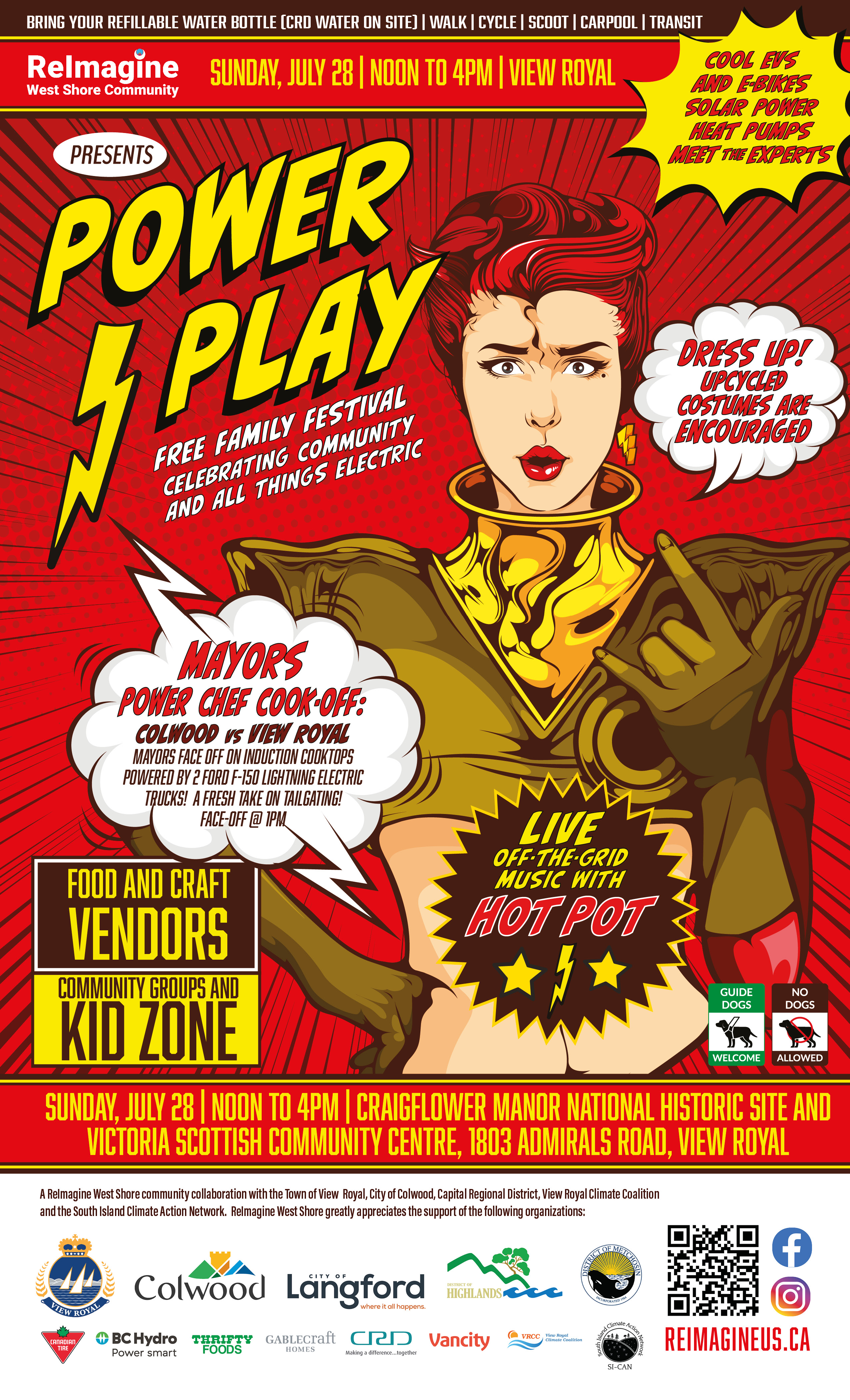 POWER PLAY is a collaboration between ReImagine West Shore and the Capital Regional District’s Climate Action Program, Town of View Royal, City of Colwood, View Royal Climate Coalition, South Island Climate Action Network, and others eager to connect community with knowledgeable people, and the products and services folks need to shift to more sustainable ways … electric transportation, heat pumps, garden tools, chef-level induction cooking, solar, and more!  We are also grateful to BC Hydro, Thrifty Foods (Admirals Walk), Canadian Tire, Gablecraft Homes, 4Mile BrewPub, and Campus Auto Group for their support of this regional outreach event.