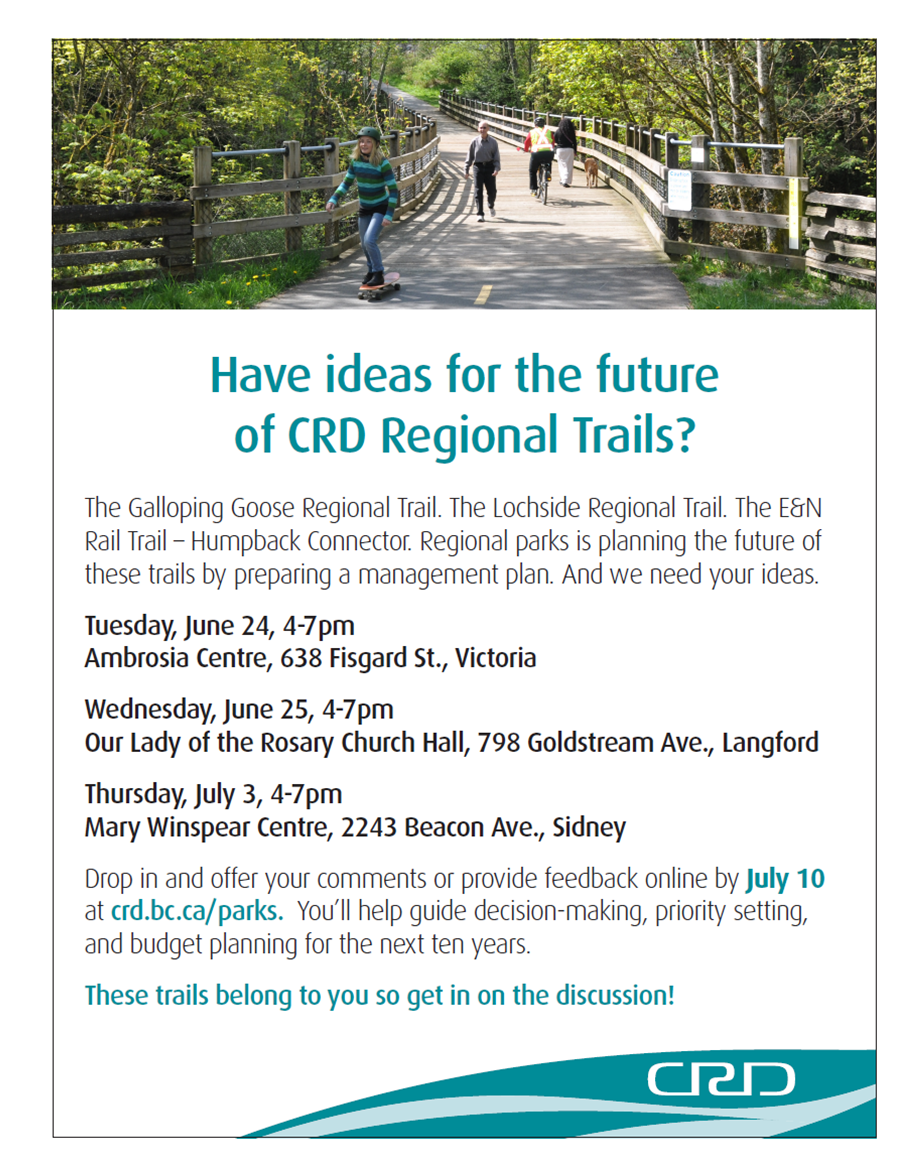 On behalf of the CRD, the public is invited to attend an information session regarding the future of CRD Regional Trails.