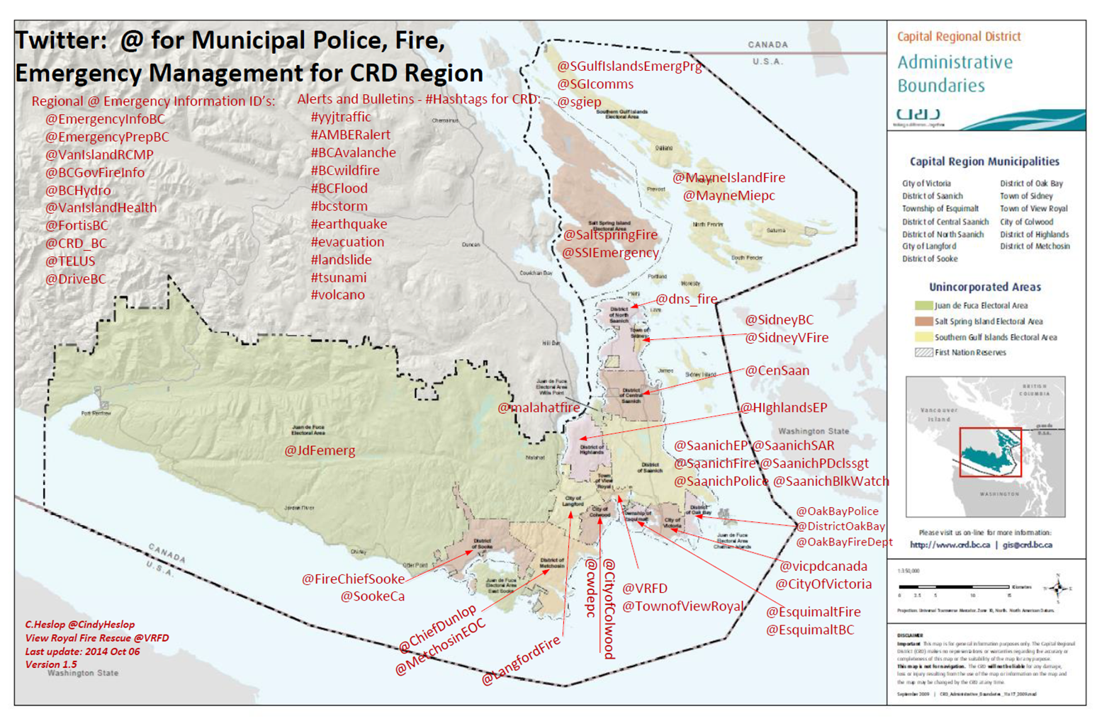 For your information, here is a map listing Twitter accounts for local governments, police and fire services within the Capital Region as well as accounts for utility service providers, Local Health Authority and Emergency Management BC. Also included on the map is a quick list of emergency hashtags in the region.
