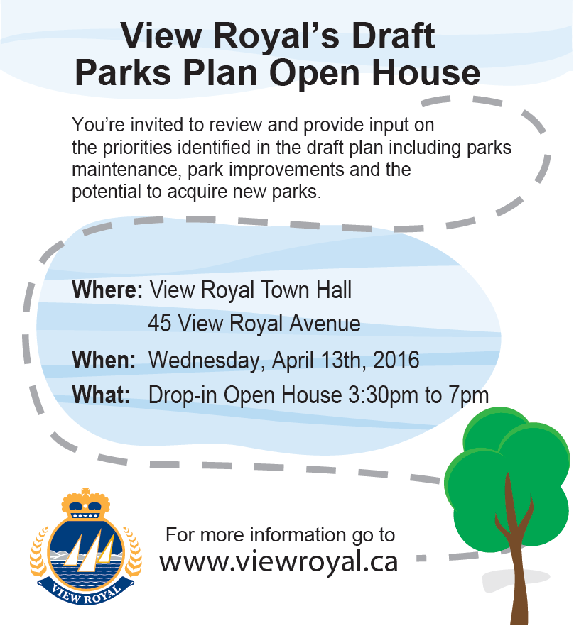 The Town of View Royal is inviting all residents to provide feedback on recommendations for a new parks master plan at a community open house on Wednesday, April 13th at Town Hall, 45 View Royal Avenue, from 3:30pm - 7:00pm. Residents will be asked to comment on recommended priorities for parkland acquisition and park improvements to be implemented over the next 20 years.
