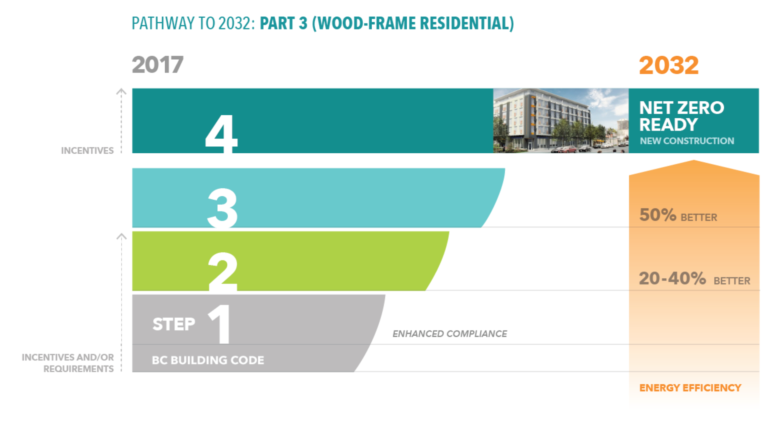 Through the BC Energy Step Code, the Province has established a series of performance requirements that will increase the energy efficiency of newly constructed buildings. The Province has created a goal that all new buildings will be net-zero energy-ready by 2032.